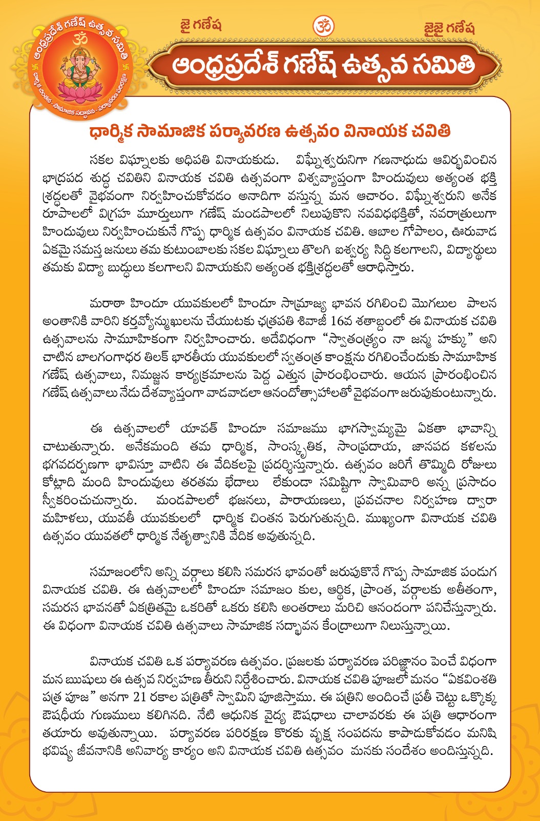 వినాయక చవితి సందర్భంగా రాష్ట్రంలోని మారుమూల పల్లెల నుండి పట్టణాల వరకు భక్తిశ్రద్ధలతో తమ కష్టాలు తొలగి, వినాయకుని అనుగ్రహం అందరికీ కలగాలని కోరుకుంటూ గణపతి మండపాలు ఏర్పాటు చేసుకొని నవరాత్రులు జరుపుకోవడం వేల సంవత్సరాలుగా ఆనవాయితీగా వస్తున్నది. ఈ ఉత్సవాల నిర్వహణకు రాష్ట్ర ప్రభుత్వం సంబందిత శాఖల ద్వార ఎటువంటి ఇబ్బందులు కలగకుండా సింగిల్ విండో పద్ధతిలో మండపాలకి సహకారం అందించాలని ఆంధ్రప్రదేశ్ గణేష్ ఉత్సవ సమితి కోరుతున్నది.
